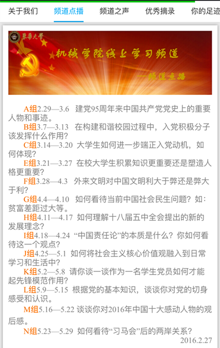 为了给广大学员提供一个发表个人观点的平台,使其在争论与探讨中深入理解党的政策与方针,提高党性修养,机械学院易班发展中心联合机械公司党校在易班上开通了名为“机械星期八”的线上学习频道,每期1个精选议题,为期一周,共12个议题,不间断推送。该线上频道自开通以来便引发公司老师、员工党员、入党积极分子和发展对象的热切关注,大家纷纷在易班上发表自己对议题的看法与见解。
