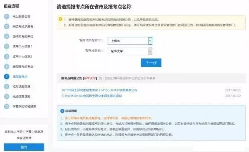 Tip:考生网上报名时必须选择就读高校或户口、工作所在地省市教育考试管理机构指定的报考点。各省市的报考点安排可在省市招办和报名点的报名公告中查看(http://yz.chsi.com.cn/sswbgg/),或咨询所在地省市招办。