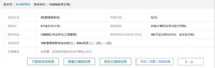 Tip:报名结束后,三天内重新登录报名系统,查看是否通过了学历校验。未通过学历校验的考生,查看是否学历证书的代码填写有误,如果是代码填写错误,点击“修改已填报信息”修改,如果是由于学历证书没有验证导致的学历校验不通过,则应及时到学籍学历权威认证机构进行认证,在现场确认时将认证报考交报考点核验。