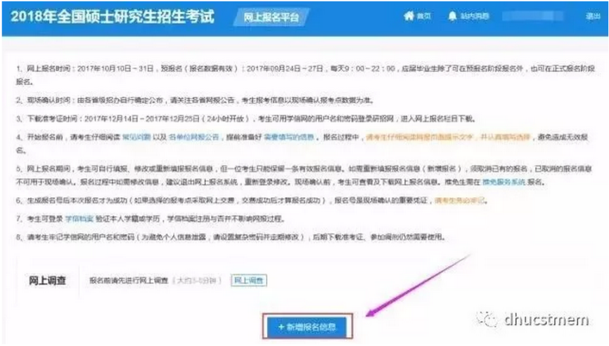 第四步:进入硕士招生报名界面,点击新增报名信息