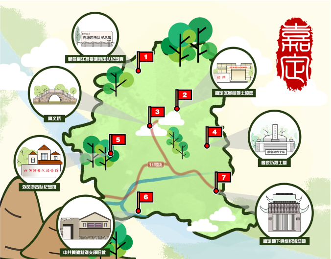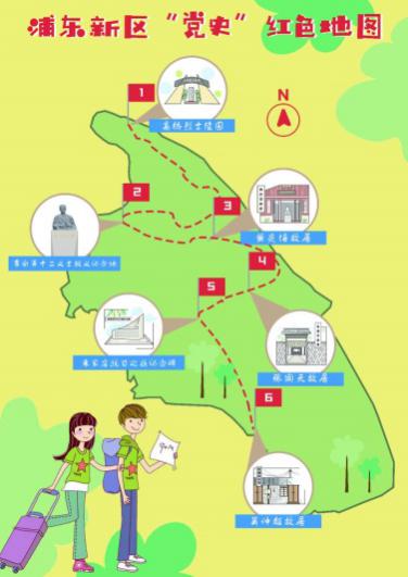 二是以各区为单位的二维平面旅游地图,实践团组织成员开展绘图工作,并采用轻松活泼的风格制作了嘉定和浦东两区的红色基地旅游地图,旨在宣传各区的红色资源,促进红色旅游文化发展。