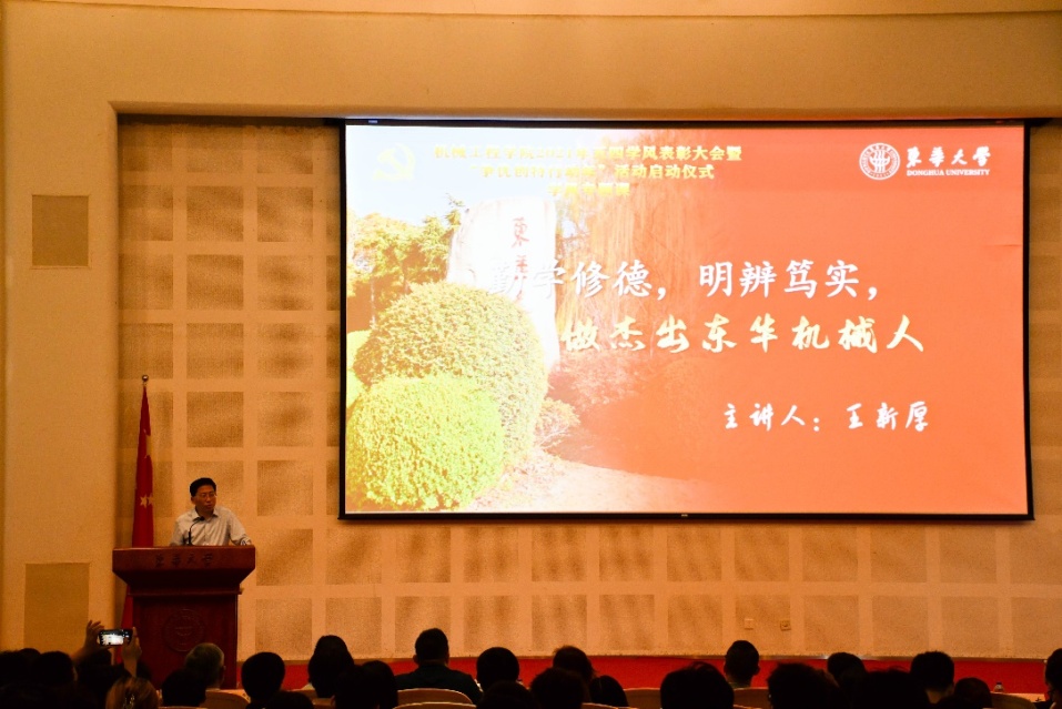 机械工程公司党委书记王新厚上学风专题课,他指出,重视学风建设是党的优良传统,弘扬优良学风是全面深化改革的必然要求,更是建设“双一流”高校的迫切需要。学风既是大学精神和文化的集中体现,也是衡量和评价一所大学办学品位和育人环境的重要标志。学风建设早已融入到校训之中,“崇德博学,砺志尚实” 在于激励全校师生修身立德、博学专攻、磨心砺志,求真求新,德才兼备。他强调,弘扬优良学风宜多管齐下、常抓不懈,一是要大力弘扬追求真理、严谨治学的求实精神;二是要大力弘扬甘为人梯、奖掖后学的育人精神;三是要大力弘扬志存高远、刻苦钻研的求学精神。他希望学院师生携手同行,践履东华精神,让“中国智造”“中国创造”扬帆起航,做杰出东华机械人。