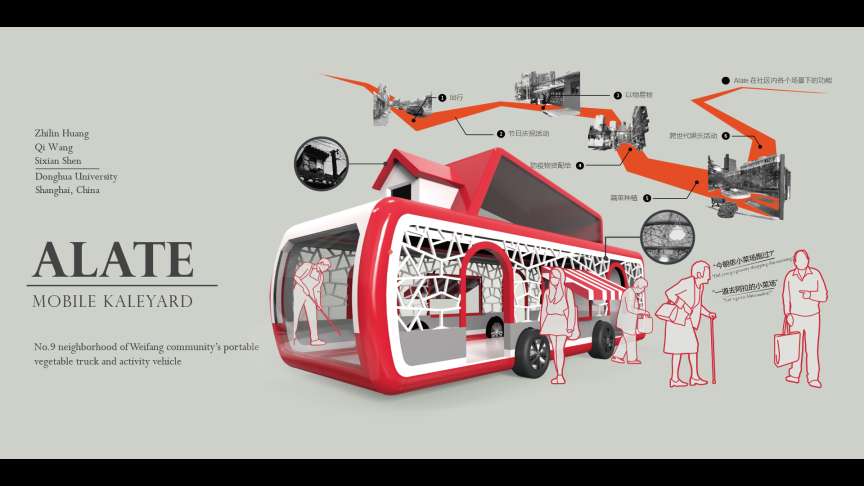 本次best365中国官方网站代表团队Alate的参赛作品,基于对上海浦东潍坊九村的实地调研,了解到在流行病期间小区关闭了几个入口,进而挖掘了老年人难以购买蔬菜的需求痛点。此外,团队观察到社区内部的合作和人际交流因隔离而减弱,因此设计了“Alate Mobile Kaleyard”,它不仅是一辆可以引进小区原有的蔬菜供应资源的蔬菜车,还是鼓励生活在同一个社区里的不同人群交流的社区活动工具,可实现功能包括种植蔬菜和举办社区老物件展览等。它不仅为购物提供了便利,而且旨在重振社区代际联系。