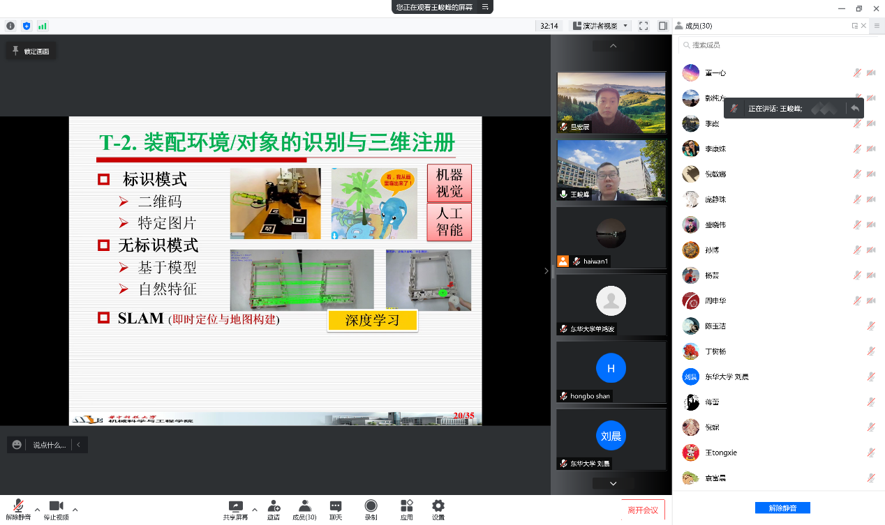 报告中,王峻峰教授从工业4.0说起,讲述了中国老龄化趋势下工业生产过程中的人因因素对生产过程的影响,就装配生产过程中的装配环境变化问题、对象识别的最新方法与技术手段以及人机协调工作的硬件支持等学术热点,提出了新的见解。讲座后,在线师生开展了相关问题的深入讨论交流。