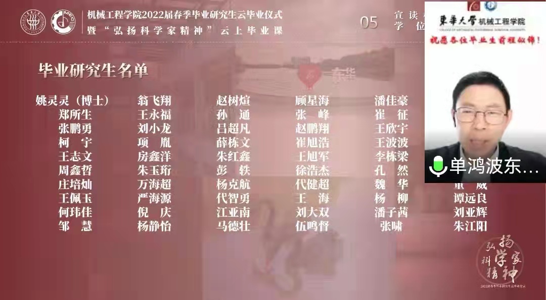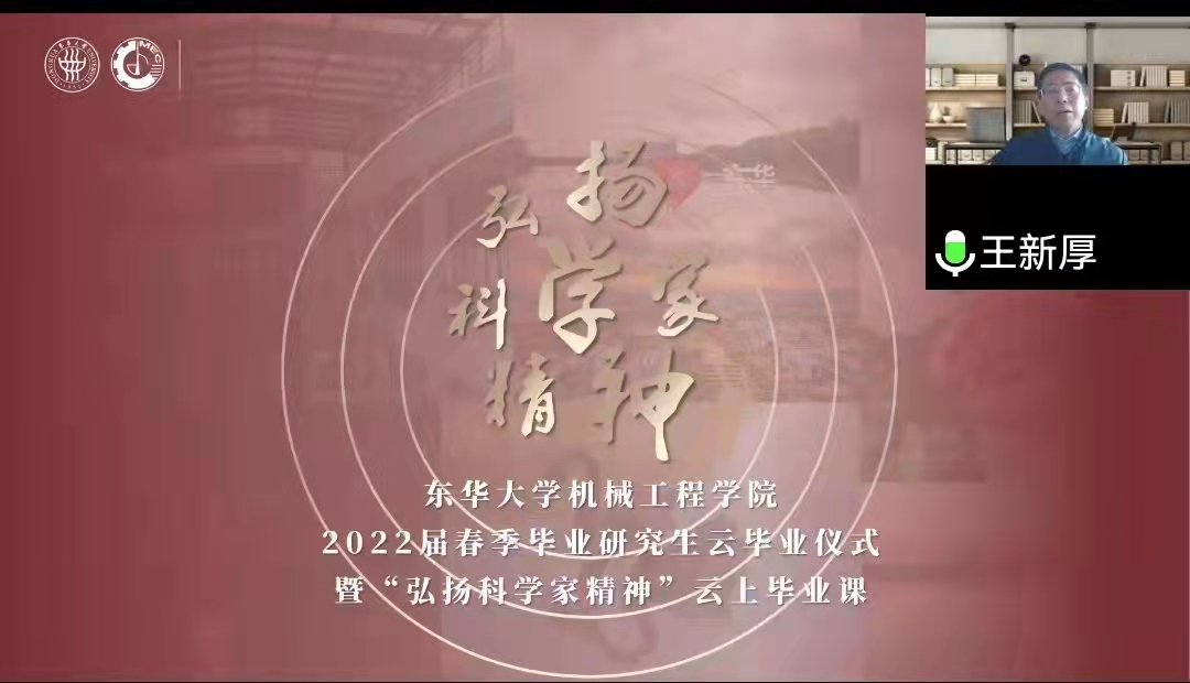 云毕业仪式在《做一颗闪耀的“螺丝钉”》云上毕业课中拉开序幕,安晴晴、宋文博等研究生毕业班辅导员和江亚南、崔旭浩等毕业生代表从科学技术发展“雄关漫道真如铁”的昨天、“人间正道是沧桑”的今天、“长风破浪会有时”的明天,勉励全体毕业生弘扬科学家精神,传承“求真务实、 创新创造、团结进取”的机械奋斗品格,做一颗闪亮的“螺丝钉”,担负起“请党放心、强国有我”的历史重任。