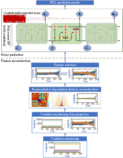 图1. 本文中提出的基于特征重构和含噪LSTM网络的设备剩余寿命预测流程