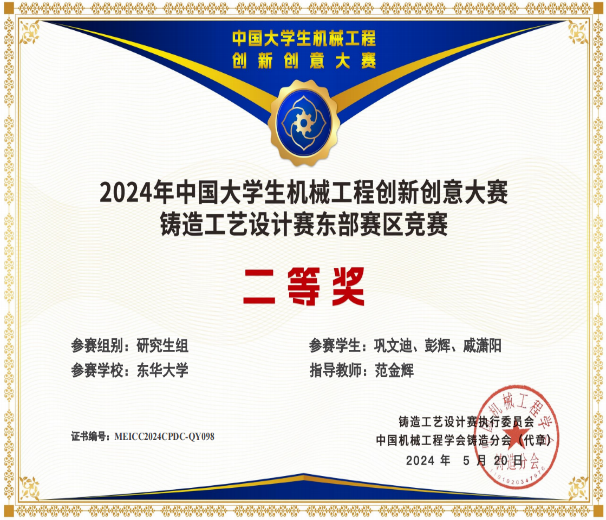 本次赛事共有132所参赛院校的1715份作品报名参赛,经校内选拔赛,最终819份作品提交至执委会参加区域赛,其中本科生组作品715份,硕士研究生组作品104份。铸造工艺设计赛全国总决赛初评评选会议于2024年5月30日在辽宁省沈阳市召开,会议期间产生了本届赛事的三等奖(部分)及入围全国总决赛终评的作品名单。公司研究生组的巩文迪、彭辉和戚潇阳同学获得了全国三等奖的好成绩,并且本科生组的骆怡彤和蒙娅同学与研究生组的尚坡、王鹭和程健森同学都进入到了决赛。后续铸造工艺设计赛总决赛终评会议将在7月8日前后举行,将与全国优秀院校角逐名次。