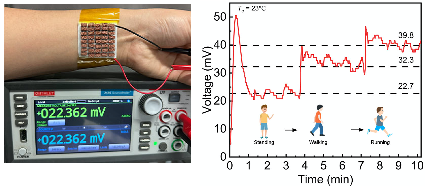 在Thermal Science and Engineering Progress上,团队设计并制备了一种集成式泡沫铜电极与嵌入式复合柔性基底的柔性热电发电器,实现了高效人体热能收集,在运动过程中持续稳定供能,展示了在可穿戴电子、健康监测和自供能系统中的巨大应用潜力。(https://doi.org/10.1016/j.tsep.2025.103750)