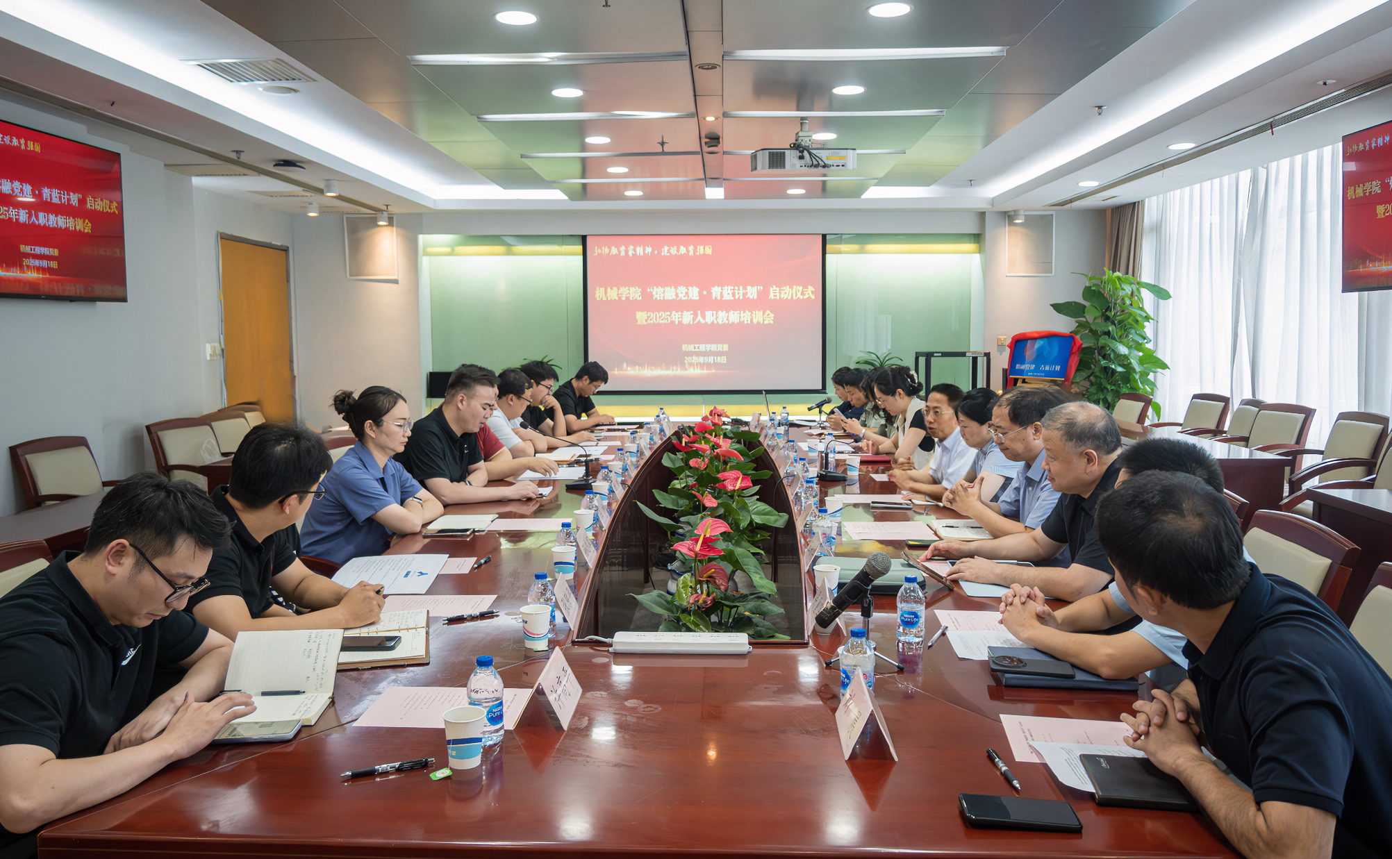9月18日,机械工程公司党委举办“熔融党建·青蓝计划”启动仪式暨2025年新入职教师培训会,公司党委教师工作部副部长、人事处副处长虞晨洁,机械工程公司党委书记王新厚,公司党委副书记杨蓉,副经理白涛,新入职教师以及“传帮带”导师、教师代表共同参会。